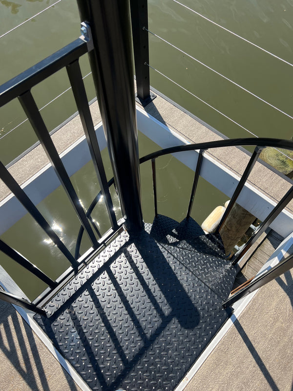 Our powder-coated aluminum railing with stainless steel cabling is designed to deliver strength, style, and long-term durability on the water. Standard on the entire roof deck, it provides secure, unobstructed views while maintaining a clean, modern look. The powder-coated finish resists rust, fading, and corrosion, making it ideal for harsh marine environments and low-maintenance ownership. Stainless steel cabling adds strength without blocking sightlines, so you can enjoy sunsets, skylines, and open water from every angle. This railing system can also be added to the front and/or back decks for a cohesive look and added safety throughout your houseboat.